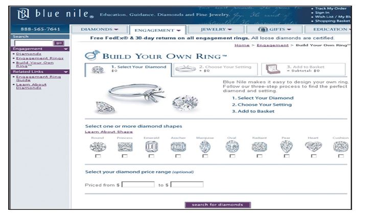 It is worth mentioning that multichannel retailers utilise various channels like store, kiosk, catalogue, call centres, web, email mobile, etc for displaying and offering products and services. The products are offered in a manner enabling individuals to have more information and thereby making informed and better purchase decision quickly and rapidly. An example has been quoted in context of online retail player name Blue nile. The web page of the retailer has been shown below in order to ascertain manner through which purchase of jewellery is being tried to make more personalised and customised. It is believed on the part of concerned retailer that offering jewellery items in a personalised and customised manner will facilitate in leading customers to make purchase decision with increased chances of repeat purchases as well.